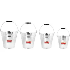 Posiadają płaskie, nisko osadzone dno.Grubość blachy 0,34mm, uchwyt pręt 5mm, rękojeść z czarnego tworzywa sztucznego, pojemność wiadra wytłoczona na dnie.