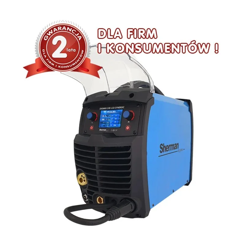 Spawarka Sherman DIGIMIG 205 LCD SYNERGIC (230V, 200A/30% IGBT, ster.cyfr., synergia, wyśw.LCD) to nowoczesna spawarka MIG/MAG z cyfrowym sterowaniem i wyświetlaczem LCD, ułatwiająca precyzyjne spawanie różnych materiałów.