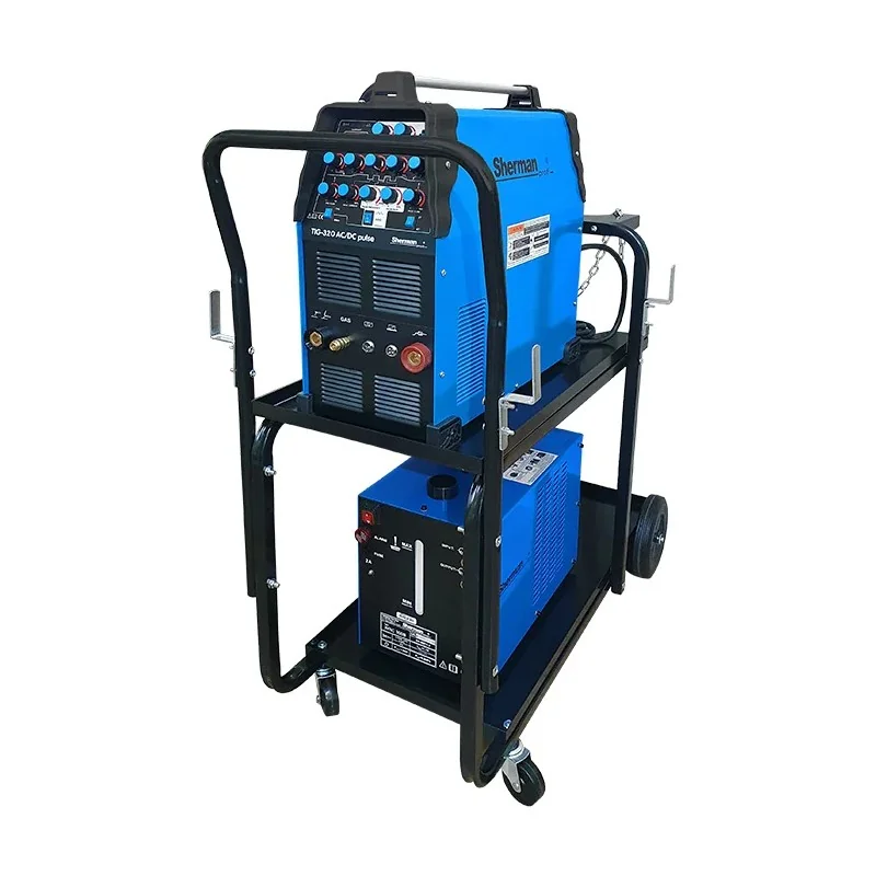 Spawarka Sherman zestaw: TIG 320 AC/DC pulse, chłodnica WRC300B, wózek TIG/MIG to kompletny zestaw spawalniczy TIG umożliwiający precyzyjne spawanie aluminium i stali, zapewnia wygodę pracy dzięki mobilności i chłodzeniu.