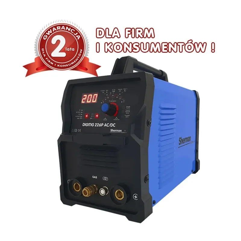 Spawarka Sherman DIGITIG 226P AC/DC (230V 200A/25% IGBT, puls, 2T/4T, wyświetlacz, ster. cyfr) to zaawansowana spawarka TIG, która umożliwia precyzyjne spawanie aluminium i stali z pełną kontrolą parametrów.