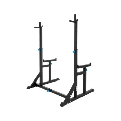 Stojaki oferują regulację wysokości w zakresie od 118 do 163 cm z 10 poziomami, co pozwala na dostosowanie do indywidualnych potrzeb i różnych rodzajów ćwiczeń, takich jak przysiady, wyciskanie na ławce czy podciąganie sztangi. Dodatkowo, środkowa półka posiada 5 poziomów regulacji wysokości (od 64 do 94 cm), co zwiększa ich funkcjonalność i bezpieczeństwo, oferując asekurację podczas ćwiczeń.