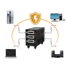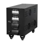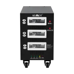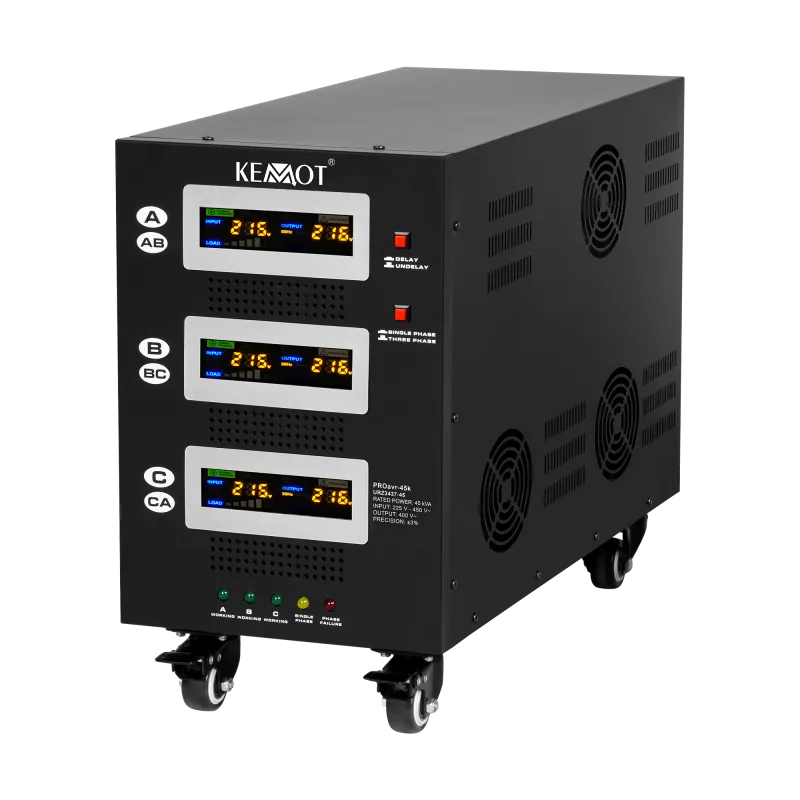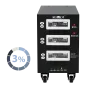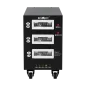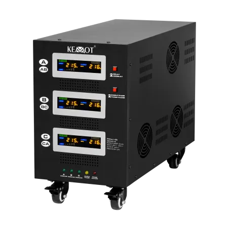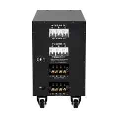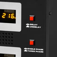Moc znamionowa: 45000 VA Zakres napięcia wejściowego: 225 - 450 V Minimalne napięcie rozruchowe: 225 V Minimalne napięcie wyjściowe: 310 V Zakres napięcia wyjściowego: 400 V Fazy: 1 / 3 fazy Precyzja stabilizacji: ± 3% Sprawność: 98% Sterowanie stabilizacją: serwo motor Transformator: C.R.G.O. toroidalny Wskaźnik: wyświetlacz LCD Częstotliwość pracy: 50 / 60 Hz Przełącznik opóźnienia startu: 6 / 180 s Materiał obudowy: stal Temperatura pracy: 0 – 40°C Wilgotność względna: 10 – 102% Temperatura przechowywania: -15oC – 45oC Zabezpieczenia: przed przeciążeniem, zwarciem, zbyt wysokim / niskim napięciem, przegrzaniem Uruchomienie chłodzenia: przy 30% mocy znamionowej Wyłączenie chłodzenia: przy 20% mocy znamionowej Wymiary: 302 x 541 x 485 mm Waga: 75 kg