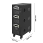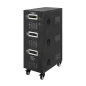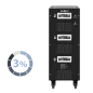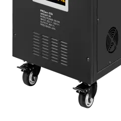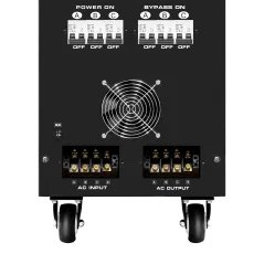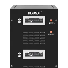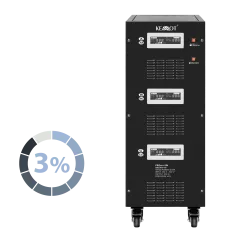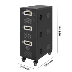 Moc znamionowa: 50000 VA Zakres napięcia wejściowego: 252 – 520 V Minimalne napięcie rozruchowe: 252 V Minimalne napięcie wyjściowe: 310 V Zakres napięcia wyjściowego: 400 V Fazy: 1 / 3 fazy Precyzja stabilizacji: ± 3% Sprawność: 98% Sterowanie stabilizacją: serwo motor Transformator: C.R.G.O. toroidalny Wskaźnik: wyświetlacz LCD Częstotliwość pracy: 50 / 60 Hz Przełącznik opóźnienia startu: 6 / 180 s Materiał obudowy: stal Temperatura pracy: 0 – 40°C Wilgotność względna: 10 – 102% Temperatura przechowywania: -15oC – 45oC Zabezpieczenia: przed przeciążeniem, zwarciem, zbyt wysokim / niskim napięciem, przegrzaniem Uruchomienie chłodzenia: przy 30% mocy znamionowej Wyłączenie chłodzenia: przy 20% mocy znamionowej Wymiary: 630 x 370 x 995 mm Waga: 129 kg