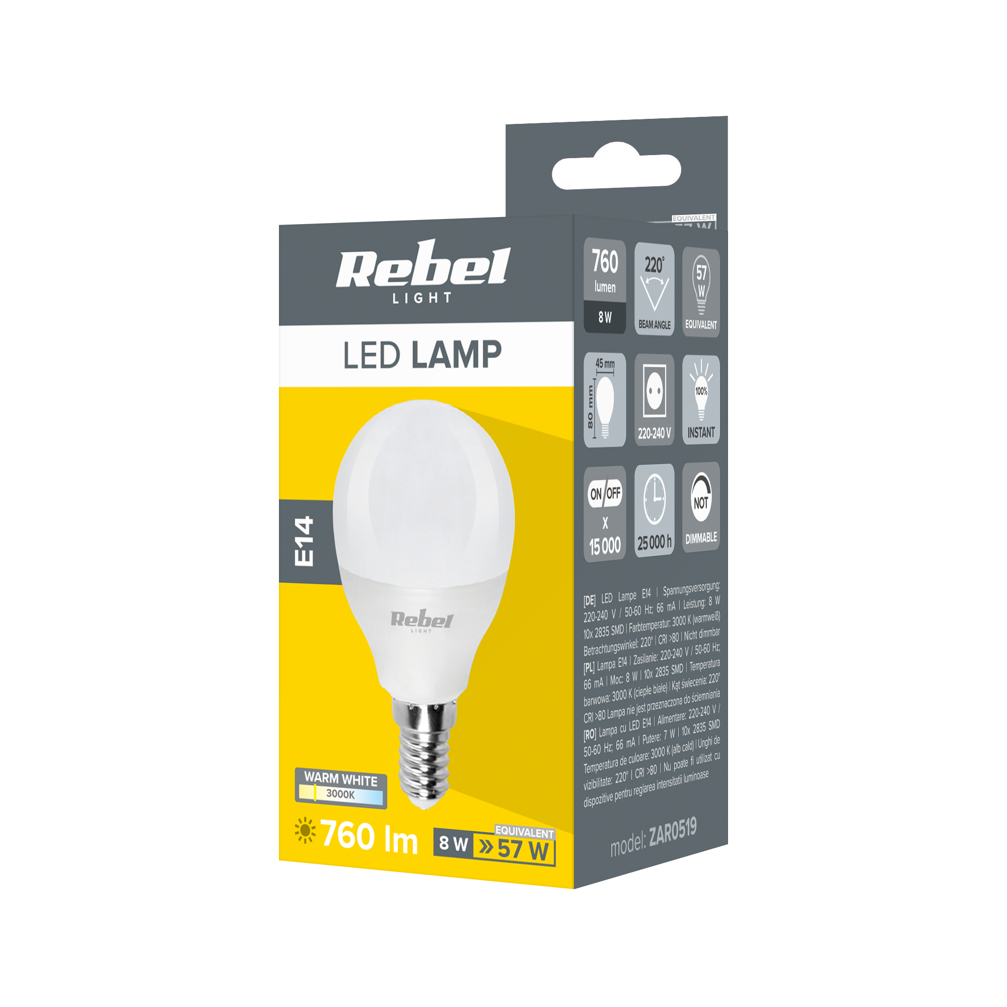 Lampa LED Rebel G45 8W to energooszczędne źródło światła, które doskonale sprawdzi się w domowych i biurowych oprawach o gwincie E14. Dzięki kompaktowym wymiarom i klasycznemu kształtowi A45, jest wygodnym zamiennikiem tradycyjnych żarówek.