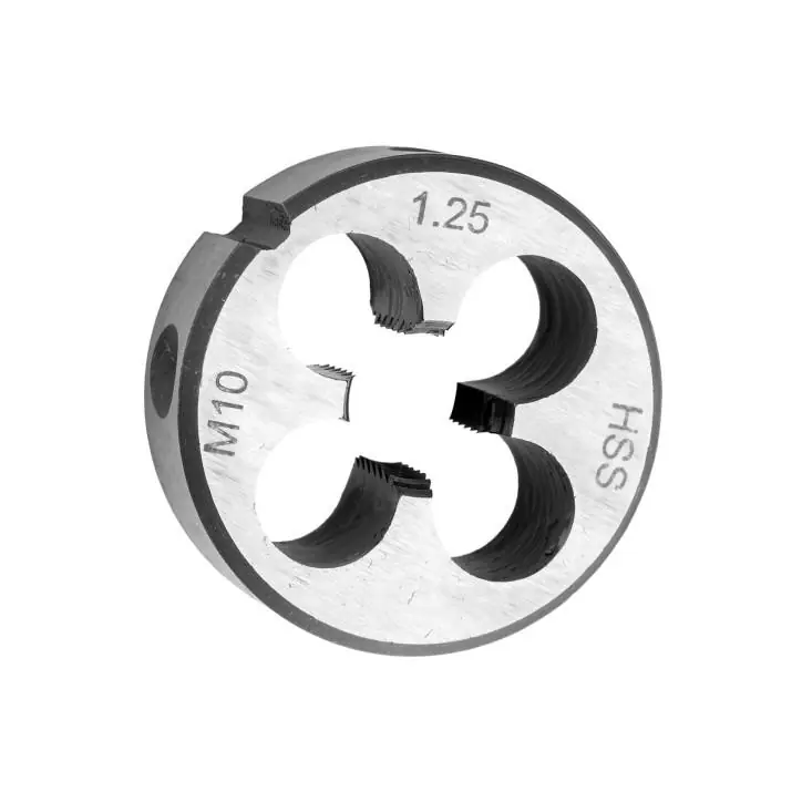 Materiał: stal HSS Skład zestawu: Jedna Narzynka Zastosowanie: Wykonywanie gwintów zewnętrznych Opis: Profesjonalna narzynka HSS do gwintowania, drobnozwojna wykonana ze specjalnej stali szybkotnącej HSS (High Speed Steel). Przeznaczona do nacinania gwintów zewnętrznych. Wykonanie narzynki jest zgodne z normą DIN 22 568. Pole tolerancji wykonanych gwintów wynosi 6g. Właściwe nacięcie gwintu odbywa się już w pierwszym przejściu roboczym, po niecałych dwóch zwojach. Oferowane w naszym sklepie narzynki drobnozwojne nadają się do profesjonalnego gwintowania elementów wykonanych ze stali niestopowych, metali, metali kolorowych, stopów metali, utwardzanych tworzyw sztucznych. Ich szczególną zaletą jest zwiększona wytrzymałość na bardzo ciężkie warunki skrawania, w tym na podwyższoną temperaturę powstałą w czasie obróbki wysokowydajnej na zwiększonych obrotach. Nadto narzynki wyróżniają się podwyższoną odpornością na zużycia ścierne i wszelkie uszkodzenia mechaniczne.