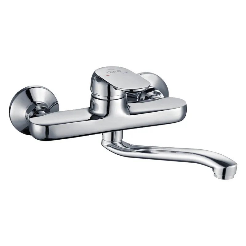 Bateria zlewozmywakowa ścienna Duro Seria Oro z ruchomą wylewką o długości 25 cm to rozwiązanie przeznaczone do montażu nad zlewozmywakiem w kuchni lub pomieszczeniu gospodarczym. Ścienny typ instalacji ułatwia wykorzystanie przestrzeni roboczej i zapewnia wygodny dostęp do wody tam, gdzie nie ma możliwości zastosowania baterii stojącej.