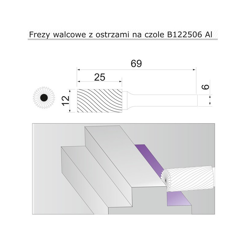 Frez 12mm AL walcowy z ostrzami na czole B122506AL to narzędzie przeznaczone do precyzyjnej obróbki aluminium. Idealny wybór do wykonywania dokładnych cięć i uzyskania gładkich powierzchni.
