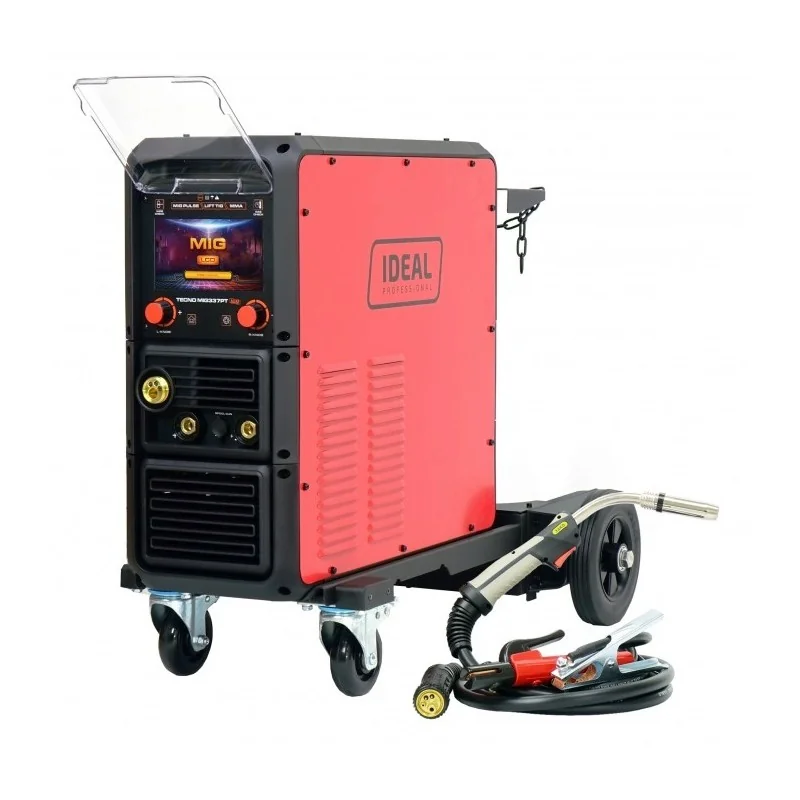 Spawarka Ideal TECNO MIG 337 PULSE SYNERGIC LCD wózek 400V to inwertorowy półautomat MIG/MAG z pulsem, umożliwiający spawanie aluminium, stali nierdzewnej i węglowej oraz lutospawanie blach ocynkowanych.