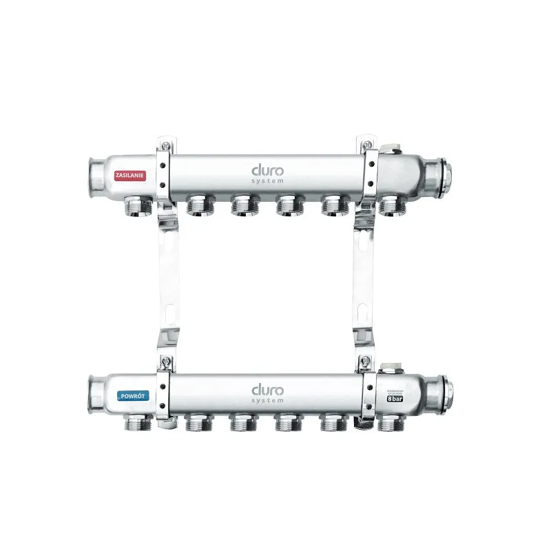 DURO SYSTEM – rozdzielacz do C.O. 1" R, 6 sekcji to element przeznaczony do podziału i sterowania sześcioma obiegami grzewczymi w instalacjach centralnego ogrzewania. Wykonany ze stali nierdzewnej, z przyłączami eurokonus 3/4" oraz zestawem montażowym. Kluczowy dla dużych systemów grzewczych, gdzie wymagana jest niezależna regulacja każdego obiegu.