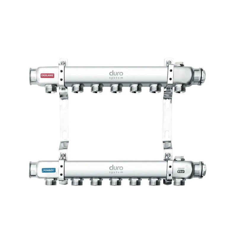 DURO SYSTEM – rozdzielacz do centralnego ogrzewania 1" R-7 sekcji to element przeznaczony do obsługi siedmiu niezależnych obiegów grzewczych w rozbudowanych instalacjach. Wyróżnia się wykonaniem ze stali nierdzewnej i przemyślaną konstrukcją, która zapewnia sprawną dystrybucję czynnika grzewczego oraz bezproblemowy montaż.
