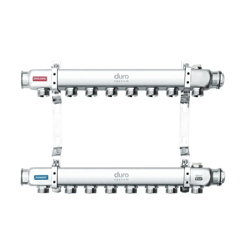 DURO SYSTEM – rozdzielacz do C.O. 1" R-8 sekcji to specjalistyczny element instalacji grzewczych, przeznaczony do rozdziału czynnika grzewczego na osiem niezależnych obiegów. Dzięki modułowej budowie i zastosowaniu stali nierdzewnej, produkt spełnia wymagania zarówno w budynkach mieszkalnych, jak i w większych obiektach komercyjnych czy przemysłowych.