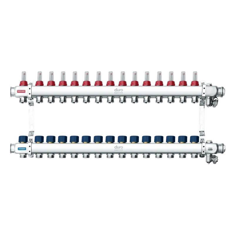 DURO SYSTEM rozdzielacz do ogrzewania podłogowego 1" R-15 sekcji to produkt, który łączy wytrzymałość stali nierdzewnej z praktycznymi rozwiązaniami ułatwiającymi codzienny montaż i eksploatację systemu ogrzewania podłogowego. Dzięki zastosowanym przepływomierzom, zaworom regulacyjnym i sprawdzonym akcesoriom, rozdzielacz gwarantuje kontrolę nad każdym obiegiem i zapewnia stabilną pracę nawet w dużych, wielostrefowych instalacjach.