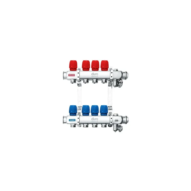 Duro System rozdzielacz z zaworami regulacyjnymi 4 sekcje umożliwia precyzyjne sterowanie czterema obiegami grzewczymi w instalacjach podłogowych lub CO. Wykonany ze stali nierdzewnej, gwarantuje odporność na korozję i trwałość.