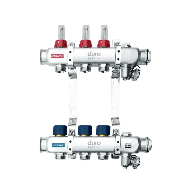 Rozdzielacz DURO SYSTEM 1" 3 sekcje to element przeznaczony do sterowania trzema obiegami ogrzewania podłogowego. Wykonany ze stali nierdzewnej, wyposażony w przepływomierze i zawory regulacyjne, ułatwia precyzyjne zarządzanie ciepłem. Kluczowe przy doborze są liczba sekcji i średnica przyłączy.