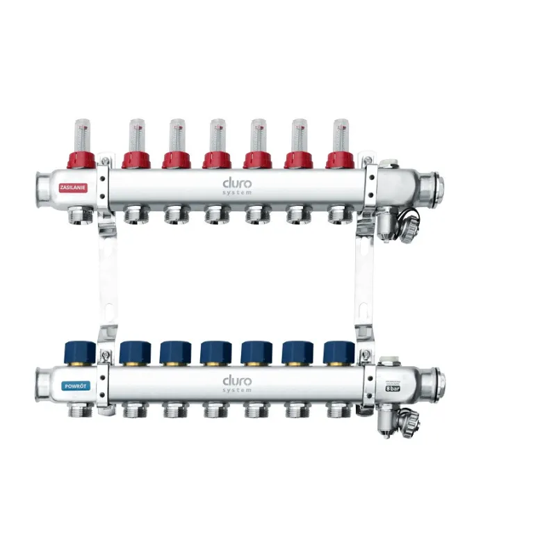 DURO SYSTEM rozdzielacz do ogrzewania podłogowego 1" R-7 sekcji umożliwia precyzyjne sterowanie siedmioma obiegami grzewczymi. Wykonany ze stali nierdzewnej 1.4301, gwarantuje odporność na korozję i długą żywotność. Posiada przepływomierze, zawory regulacyjne i odpowietrzniki, co ułatwia montaż i serwis. Kluczowe przy doborze: liczba sekcji, rodzaj przyłączy i kompatybilność z instalacją.