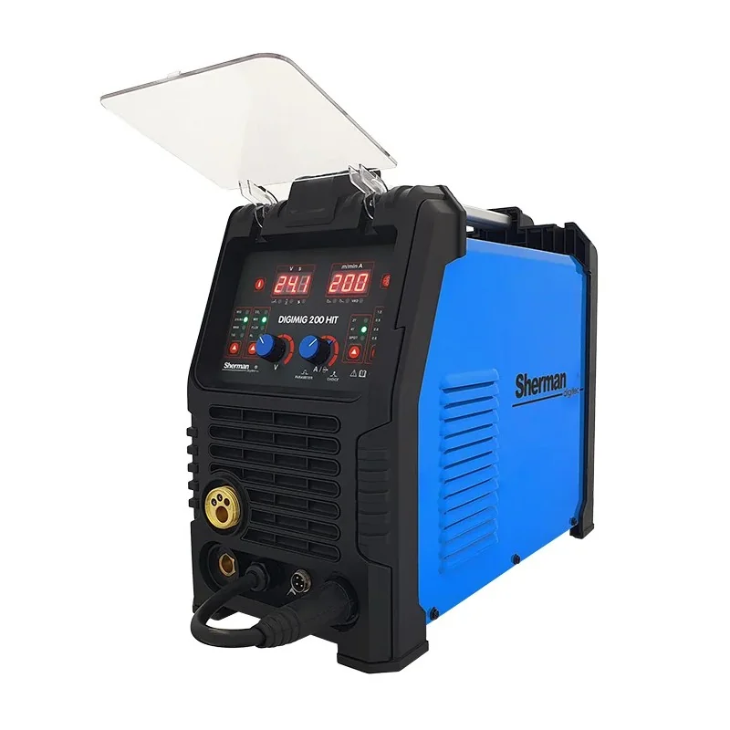 Spawarka Sherman DIGIMIG 200 HIT (230V 200A/60% IGBT, 2R, 2T/4T, ster cyfr., synergia) to zaawansowany sprzęt MIG/MAG, który dzięki funkcji synergii ułatwia precyzyjne spawanie stali i aluminium.