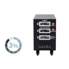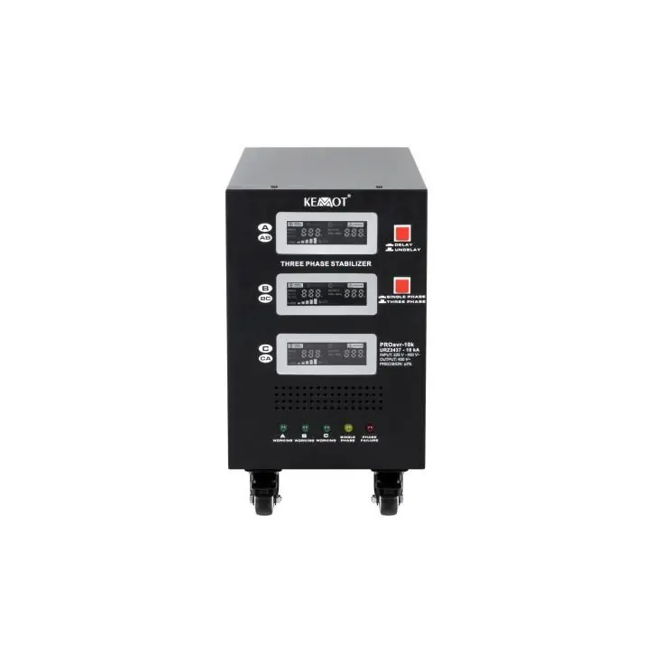 W trybie jednofazowym każda z faz może pracować niezależnie od siebie. Niezależnie od obciążenia sieci i wahań napięcia wyjściowego, stabilizator KEMOT PROavr-10 utrzymuje je na poziomie 230 V ±3%, pozwalając na wydajną pracę wszystkich urządzeń, w tym tych wrażliwych na jakość napięcia sieci. Regulacja odbywa się automatycznie, co zapewnia wysoką dokładność napięcia wyjściowego. Błąd w działaniu jednej z faz nie wpływa na pracę pozostałych.