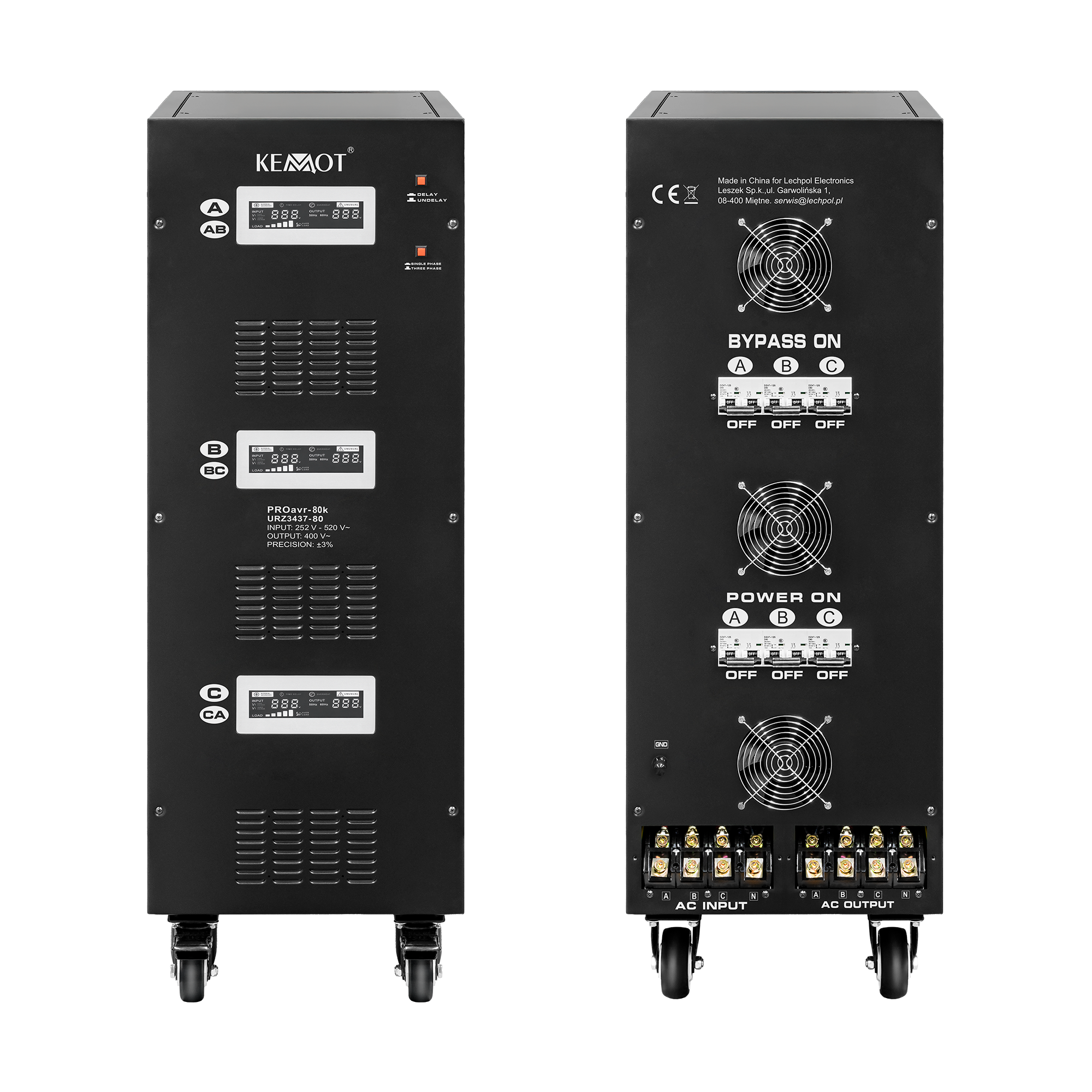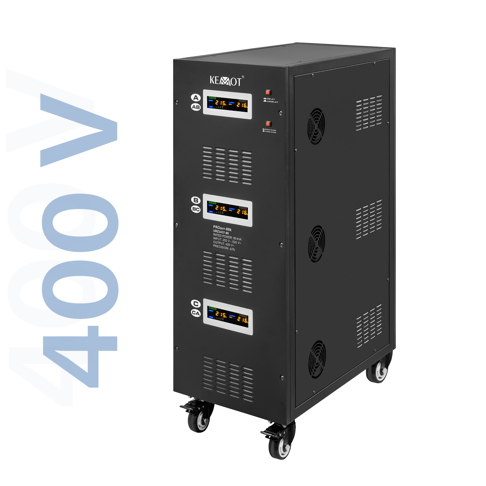 W trybie jednofazowym każda z faz może pracować niezależnie od siebie. Niezależnie od obciążenia sieci i wahań napięcia wyjściowego, stabilizator KEMOT PROavr-80k utrzymuje je na poziomie 230 V ±3%, pozwalając na wydajną pracę wszystkich urządzeń, w tym tych wrażliwych na jakość napięcia sieci. Regulacja odbywa się automatycznie, co zapewnia wysoką dokładność napięcia wyjściowego. Błąd w działaniu jednej z faz nie wpływa na pracę pozostałych.