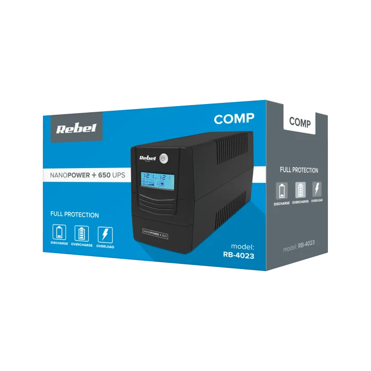 Zasilacze awaryjne Rebel wyróżniają się intuicyjną obsługą. Wystarczy podpiąć urządzenie do gniazda sieciowego i podłączyć do niego sprzęty takie jak komputer, laptop, router czy kasa fiskalna, a w przypadku awarii sieci energetycznej ich praca będzie kontynuowana. Co więcej, model RB-4023 wyposażony został w czytelny wyświetlacz LCD, na którym szybko sprawdzisz aktualny status pracy UPS'a.